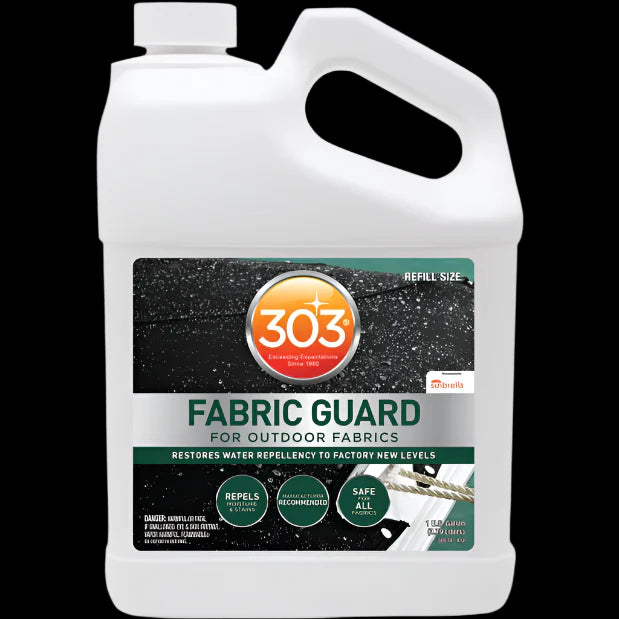 303 Fabric Guard is the only product recommended by and for Sunbrella, as well as other fabric manufacturers to restore lost water repellency to fabrics. Resist water, even when you're on the water. 303 Fabric Guard creates a powerful shield to greatly increase water and stain repllency, protecting against both oil and water based stains. Spray it on fabric seats, boat covers, awnings, Dacron sails, etc. Keep all your favorite fabrics crisp and clean for years to come.