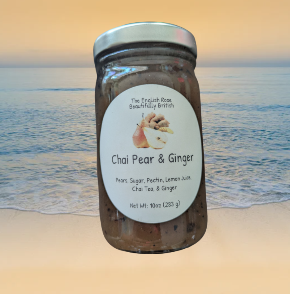 Chai Pear & Ginger jam by The English Rose "Beautifully British" Jams and Spice Blends is hand-crafted and comes in an 8 ounce jar.