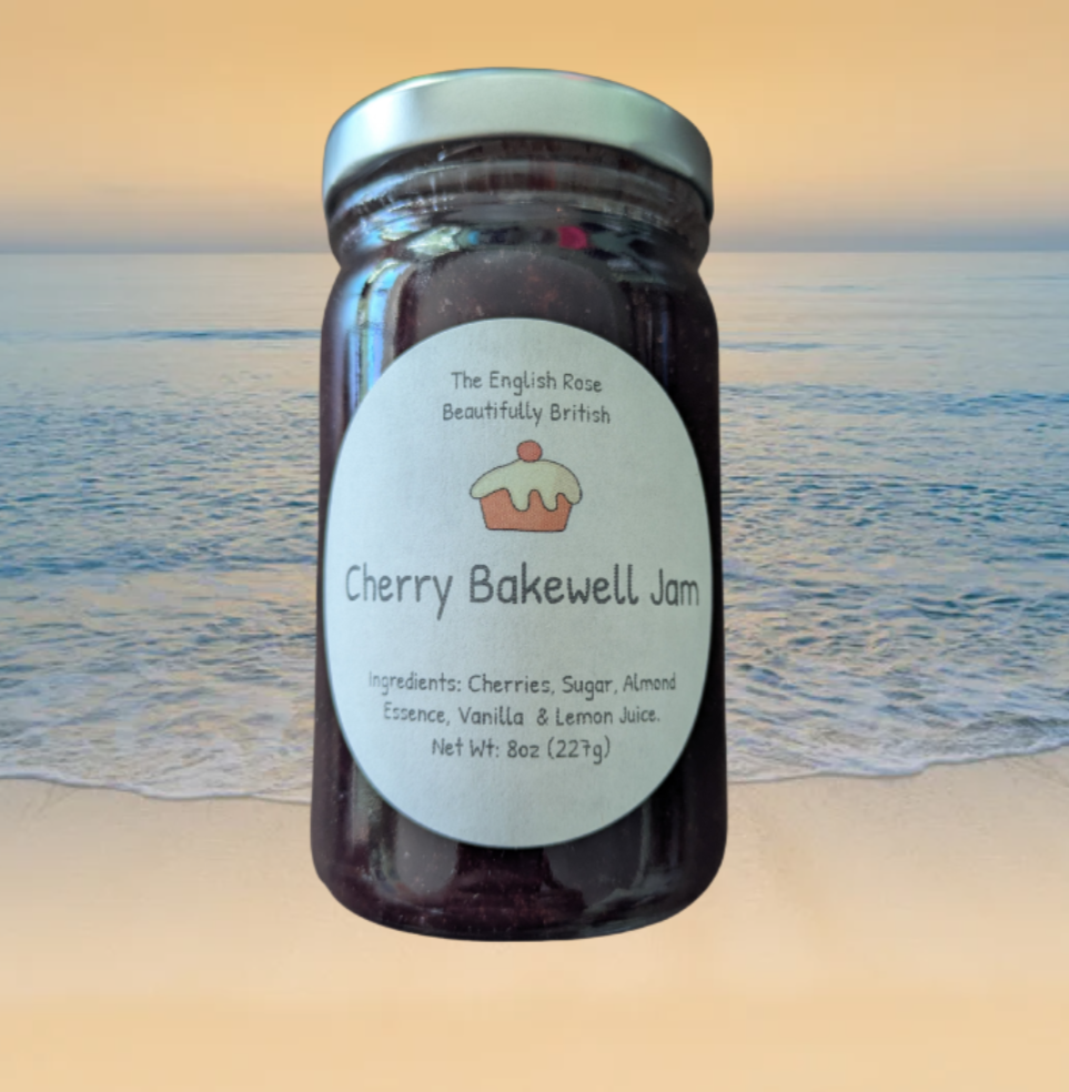 Cherry Bakewell jam by The English Rose "Beautifully British" Jams and Spice Blends is hand-crafted and comes in an 8 ounce jar.