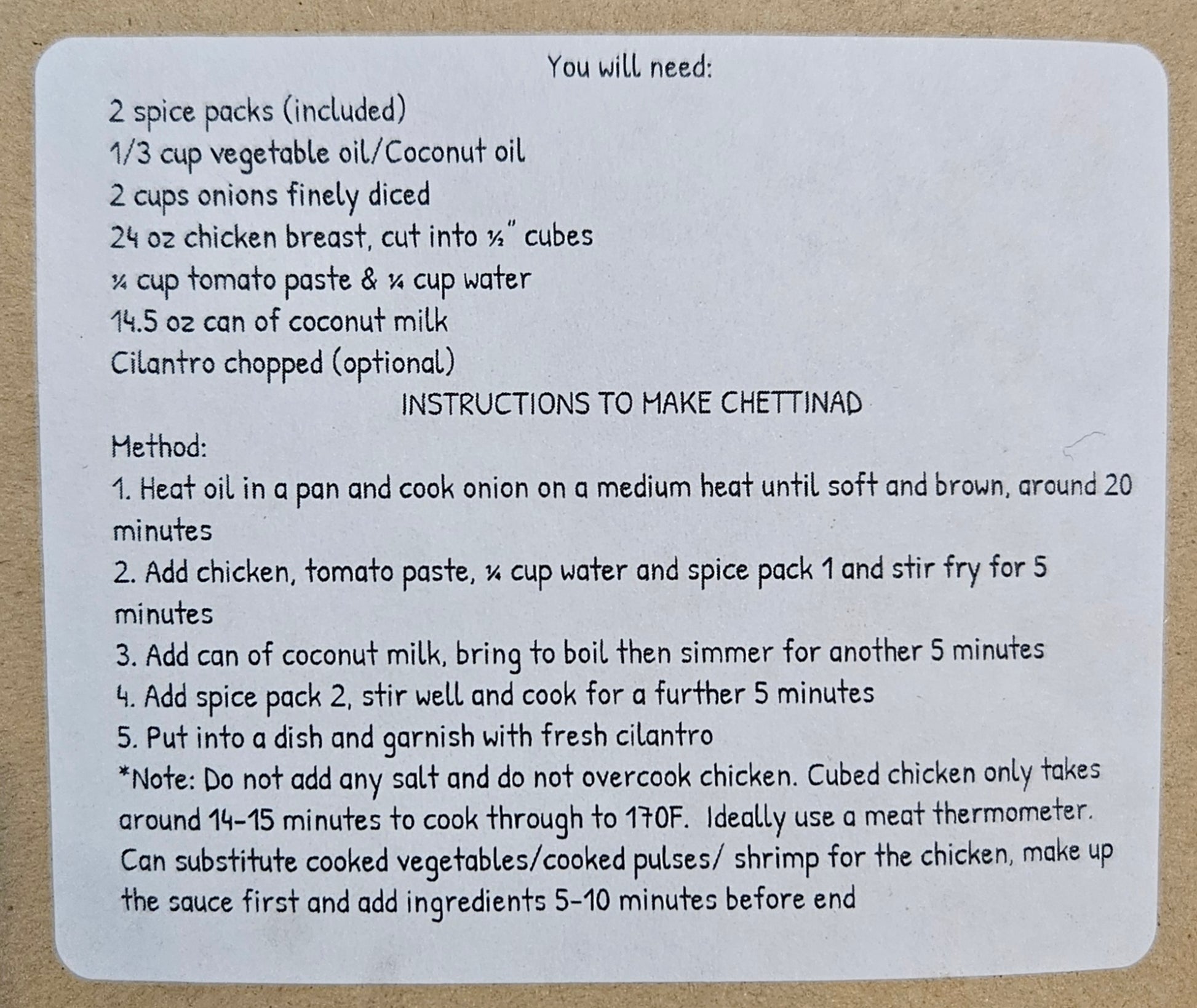 Chettinad Spice Pack (meal kit), just add chicken or veggies and a few other household ingredients.