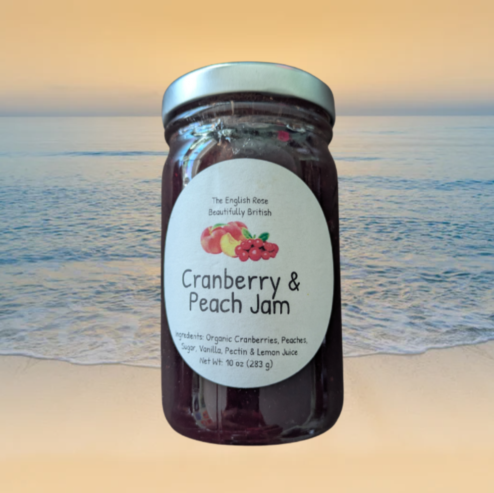 Cranberry & Peach jam by The English Rose "Beautifully British" Jams and Spice Blends is hand-crafted and comes in an 8 ounce jar.