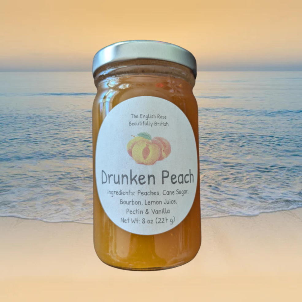 Drunken Peach jam by The English Rose "Beautifully British" Jams and Spice Blends is hand-crafted and comes in an 8 ounce jar.