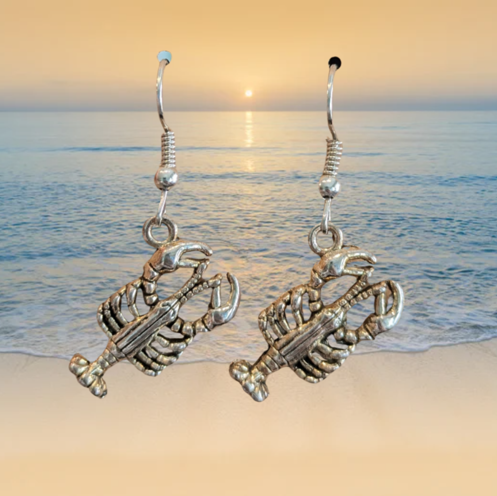 Add a playful touch to your jewelry collection with Lobster Dangle Earrings. Created by local artist Unique Peace by Kristen, these silver earrings feature a lobster design that hangs 1 1/2 inches from stainless steel hooks plated with sterling silver. Embrace your quirky side with these one-of-a-kind earrings!