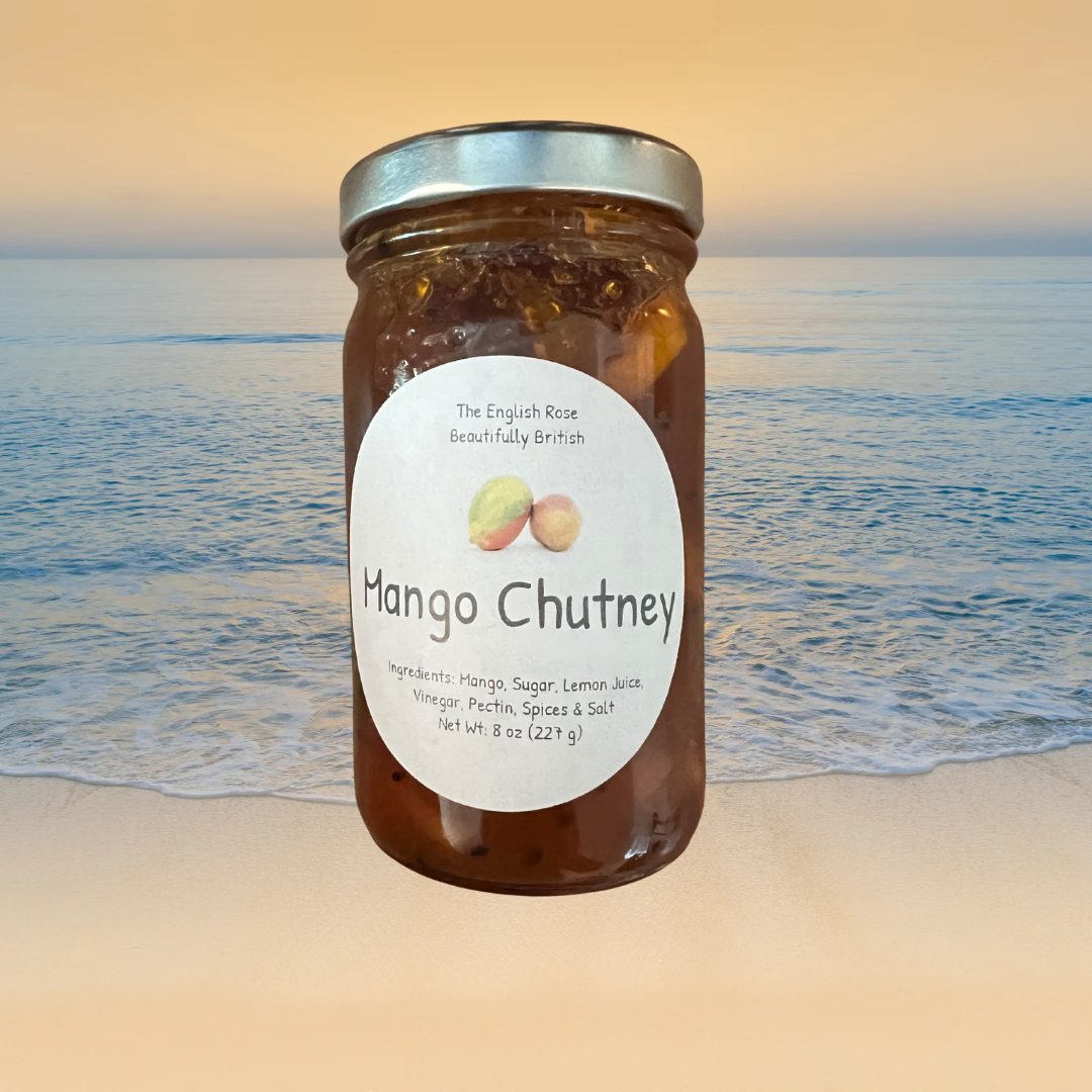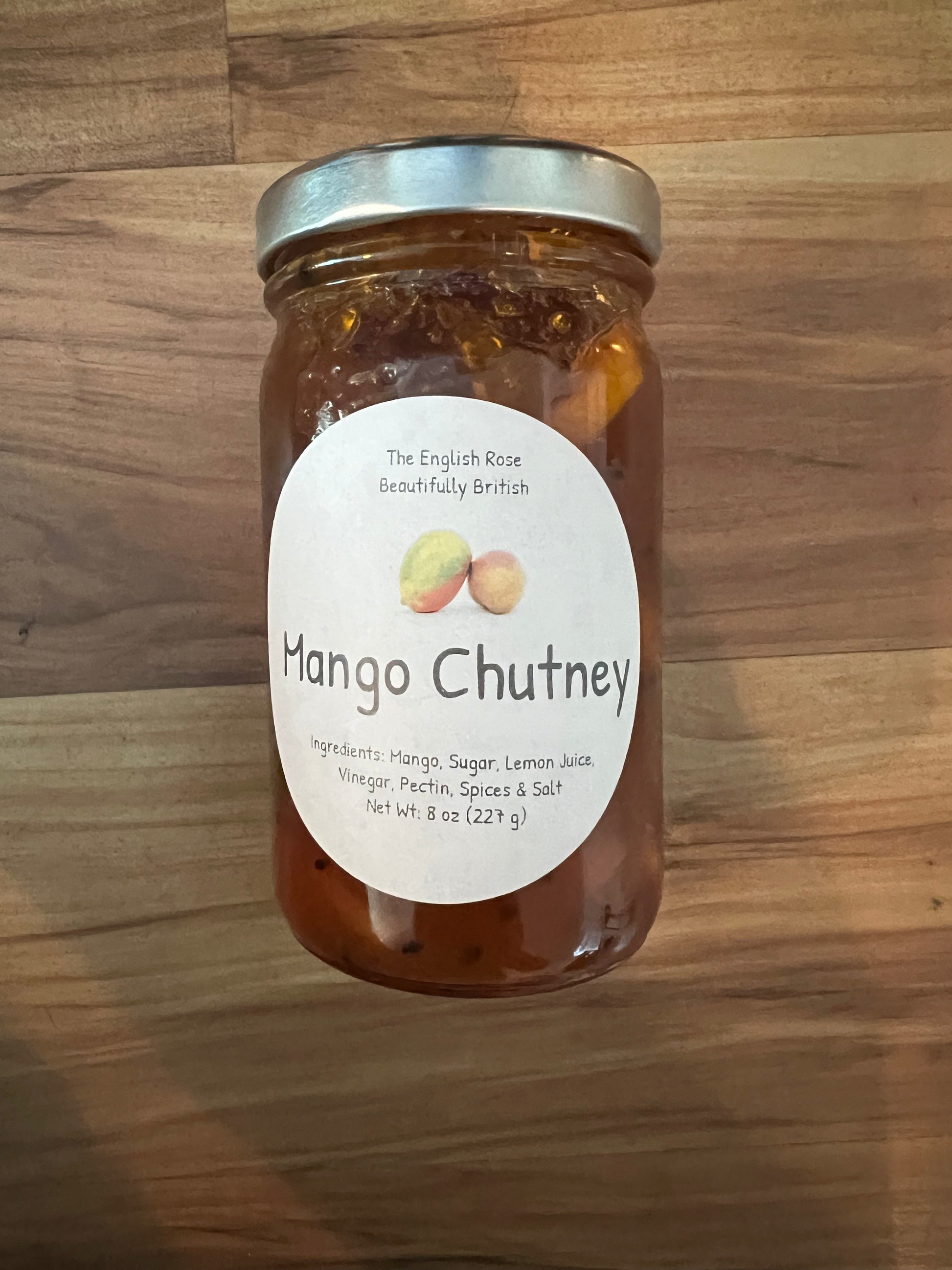 Mango chutney jam by The English Rose "Beautifully British" Jams and Spice Blends is hand-crafted and comes in an 8 ounce jar.