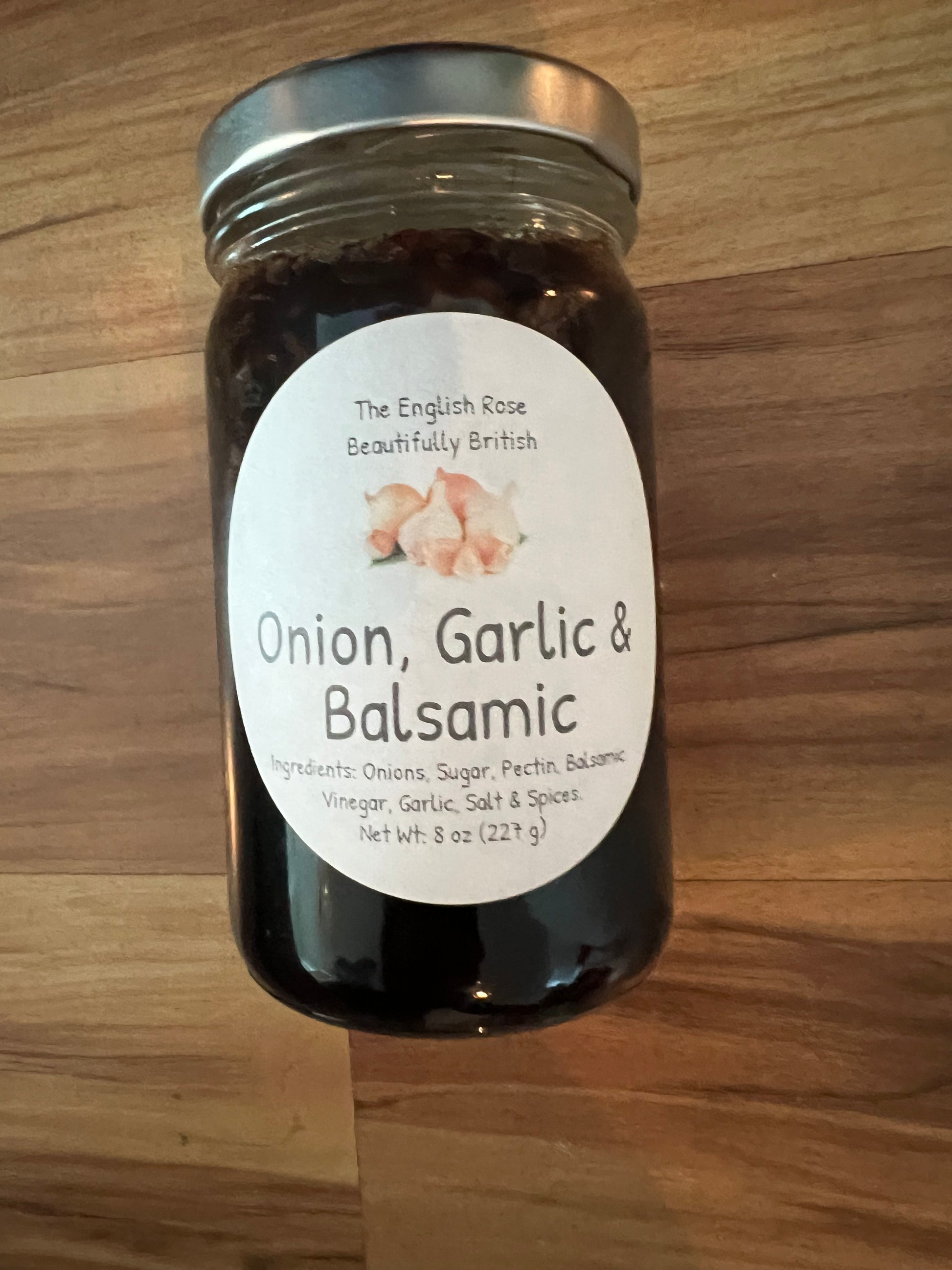 Onion Garlic Balsamic jam by The English Rose "Beautifully British" Jams and Spice Blends is hand-crafted and comes in an 8 ounce jar.