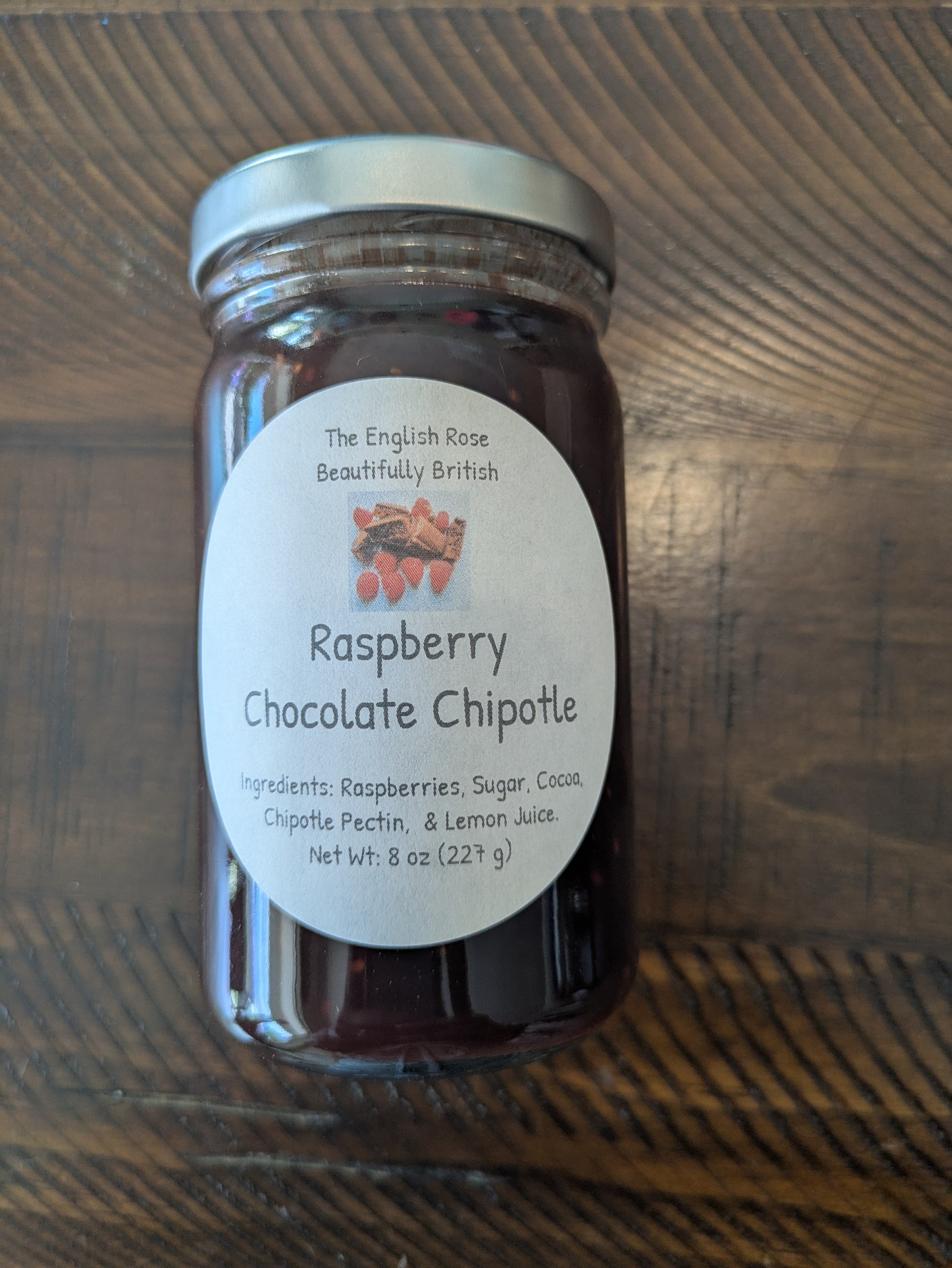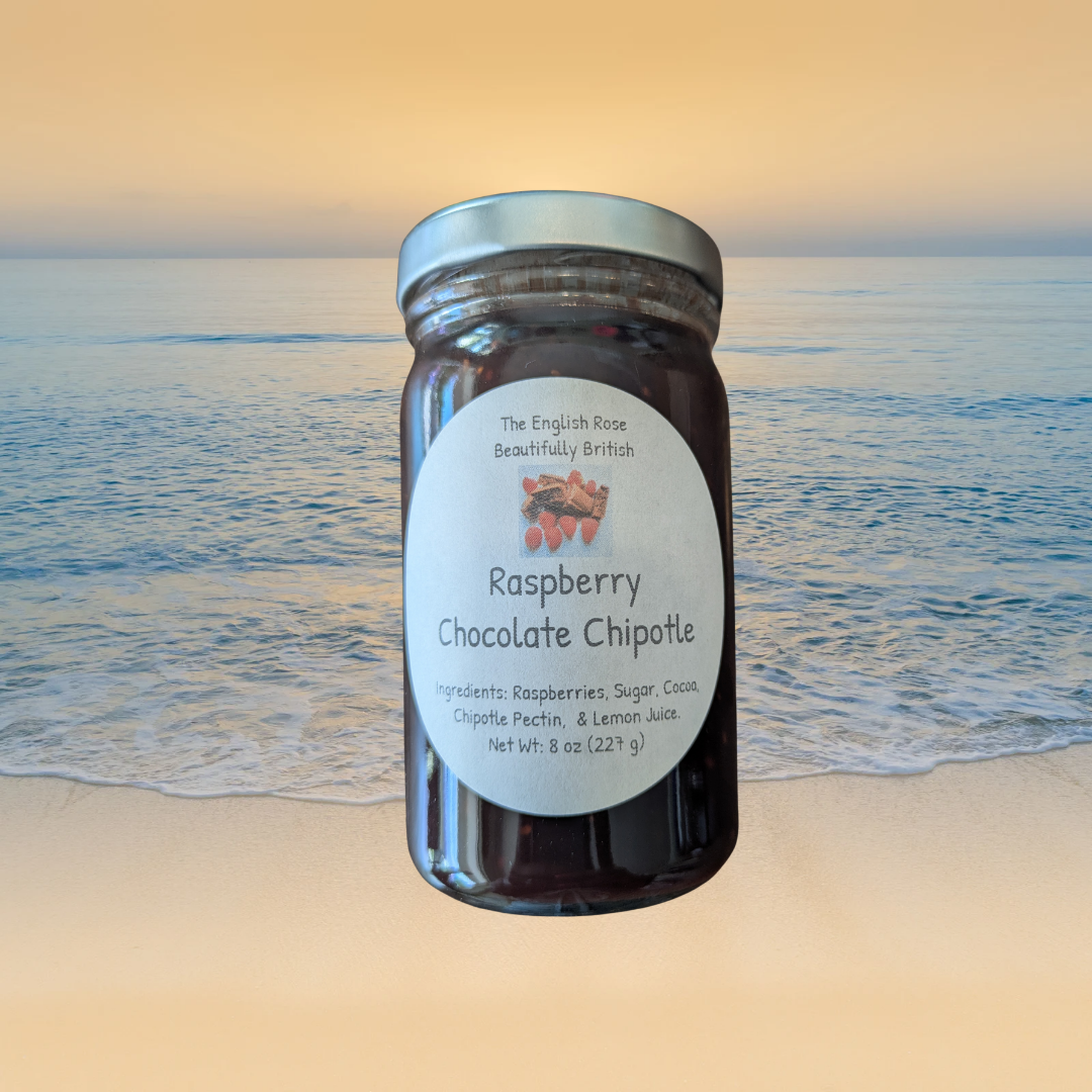 Raspberry Chocolate Chipotle jam by The English Rose "Beautifully British" Jams and Spice Blends is hand-crafted and comes in an 8 ounce jar.