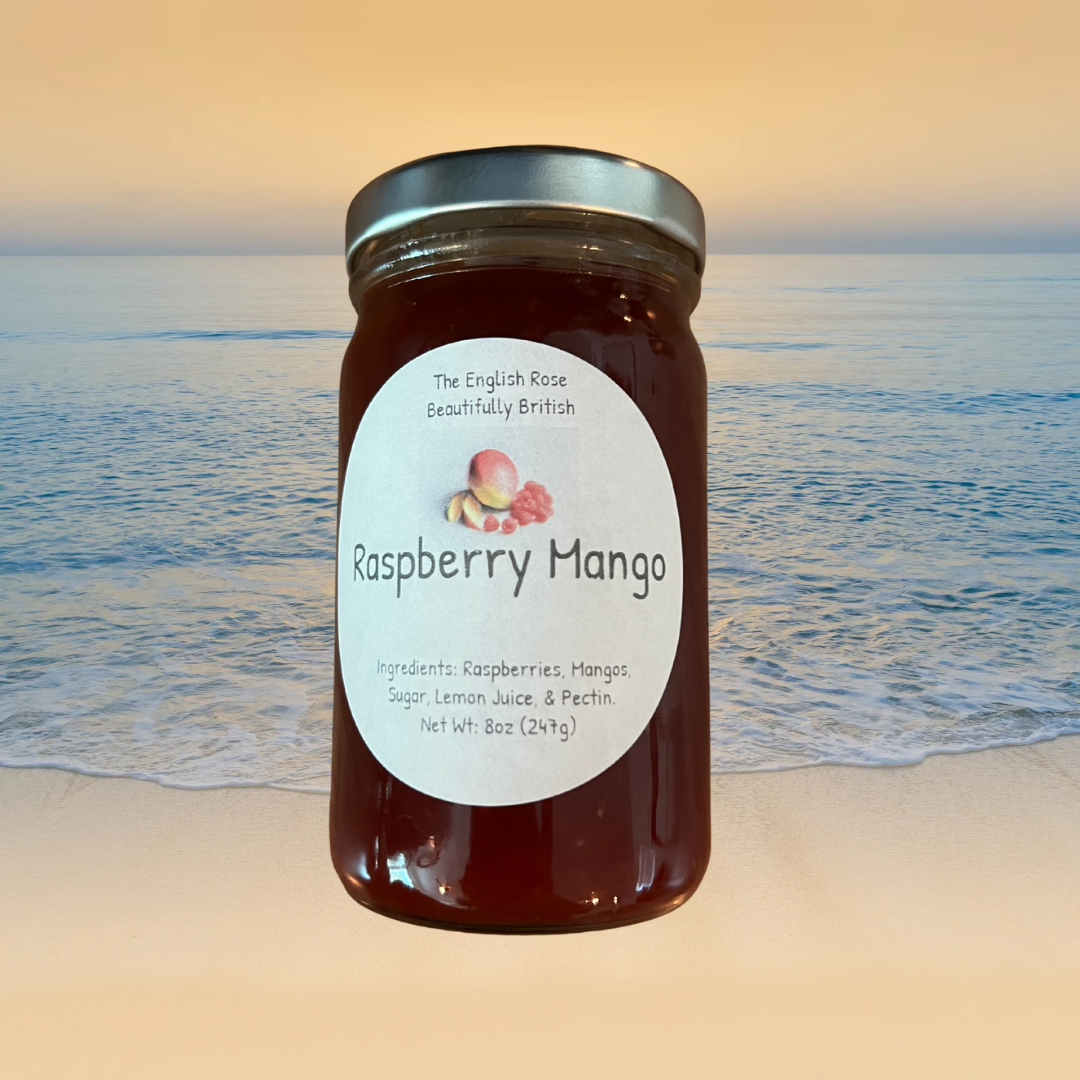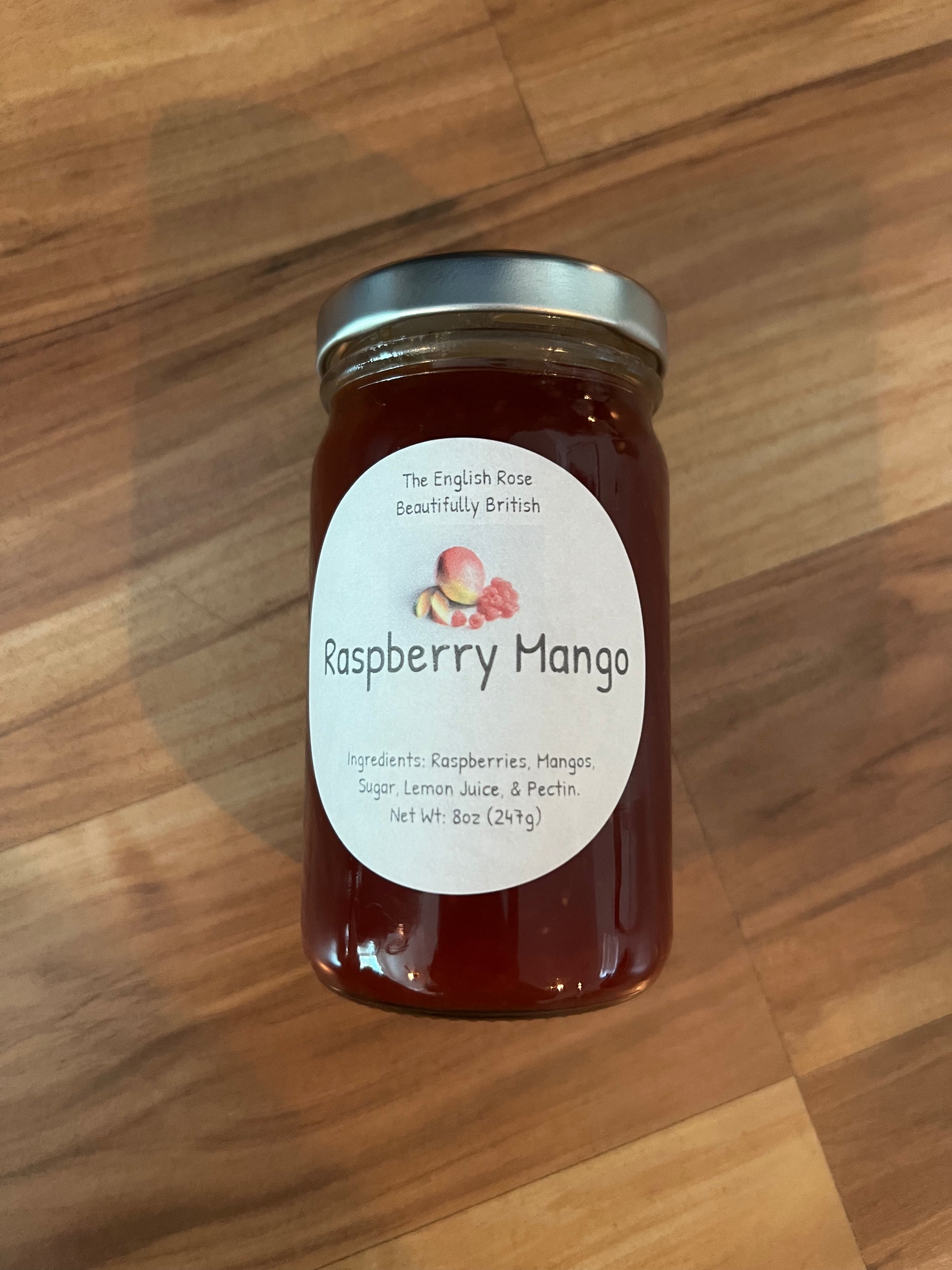 Raspberry Mango jam by The English Rose "Beautifully British" Jams and Spice Blends is hand-crafted and comes in an 8 ounce jar.