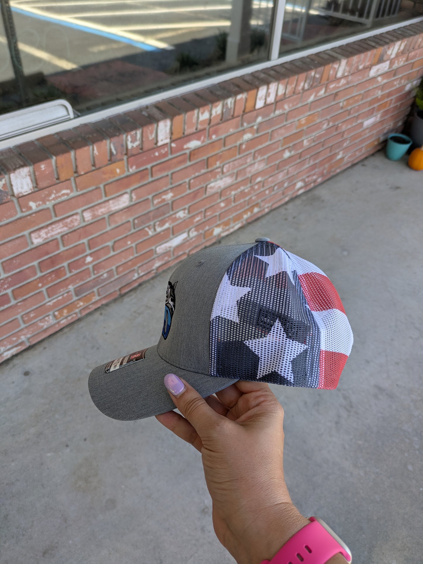Reel in the compliments with our Reel Deal Snapback trucker hat crafted with a stylish RD embroidery design. This hat has a grey front and red white and blue American flag mesh. Adjustable for any size. This unisex trucker hat is perfect for any occasion. Don't let this deal slip away.