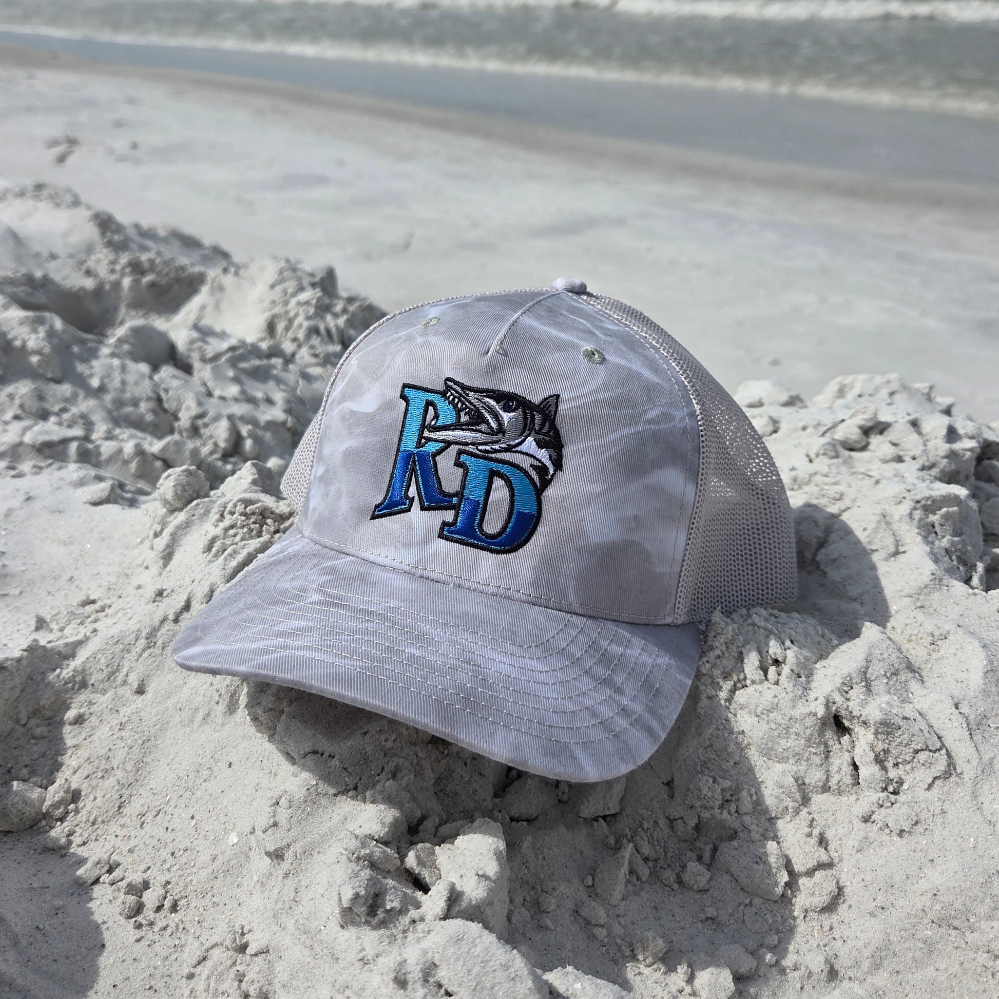 Get hooked on style with the Reel Deal Bonefish Camo Trucker Hat! Featuring an embroidered RD Barracuda logo and a snapback design, this unisex hat is perfect for any adventure. Stay cool and comfortable while looking fly in this unique camo trucker hat. (I'm hooked, get it?!)