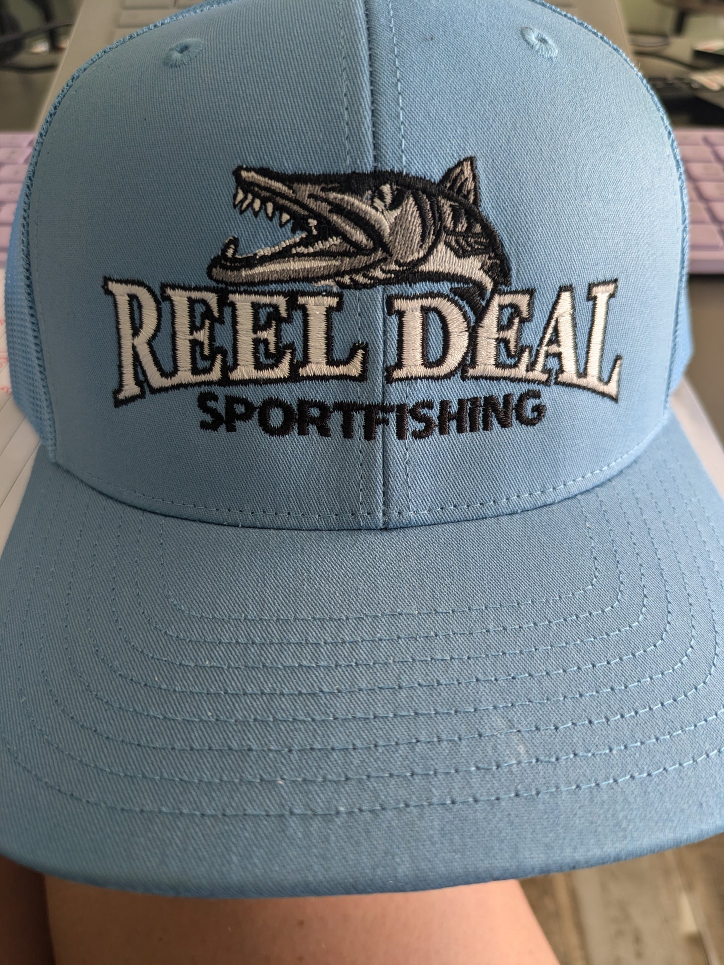 Reel in the compliments with our Reel Deal Snapback trucker hat crafted with a stylish embroidery design. This hat is Columbia Blue matching front and mesh. Adjustable for any size. This unisex trucker hat is perfect for any occasion. Don't let this deal slip away.