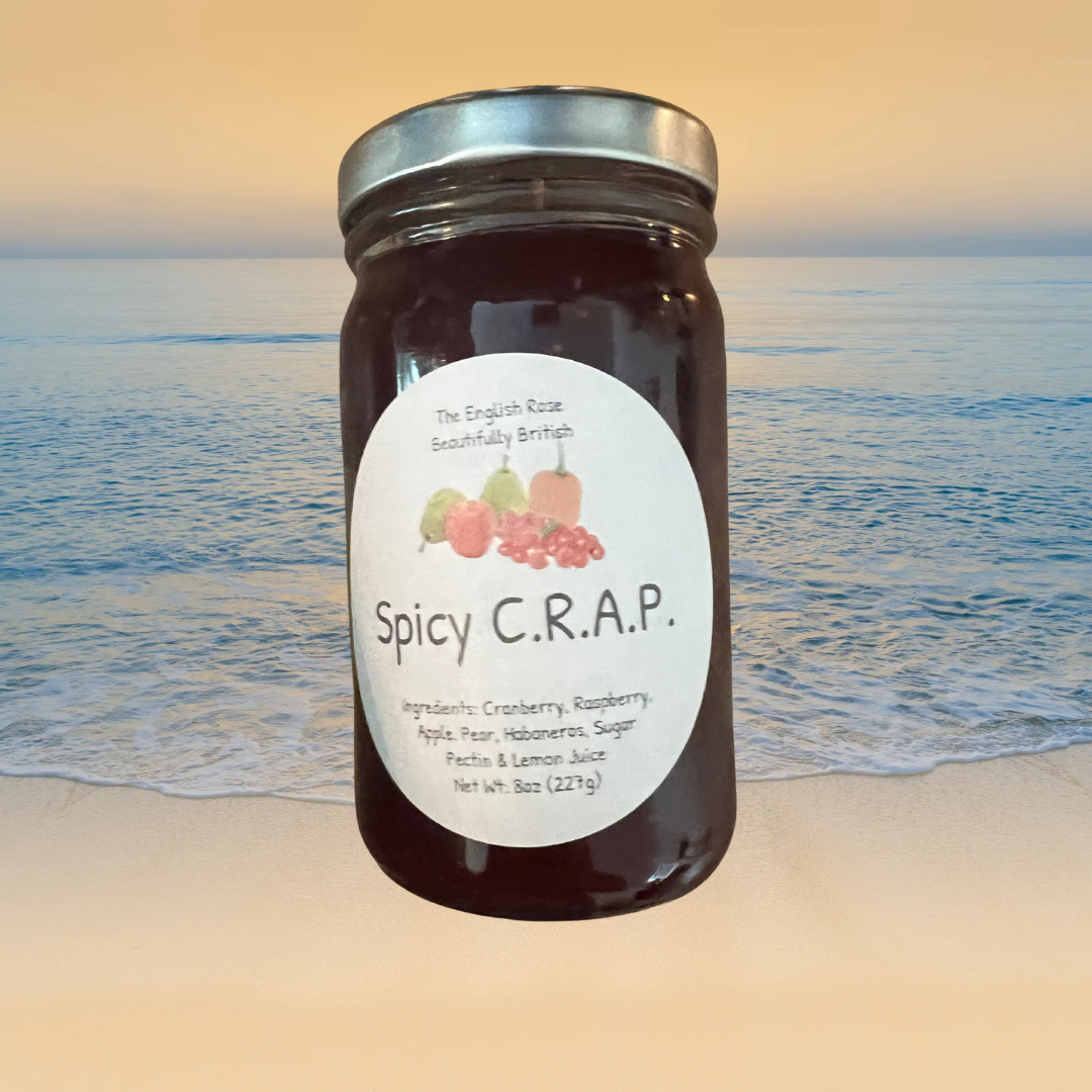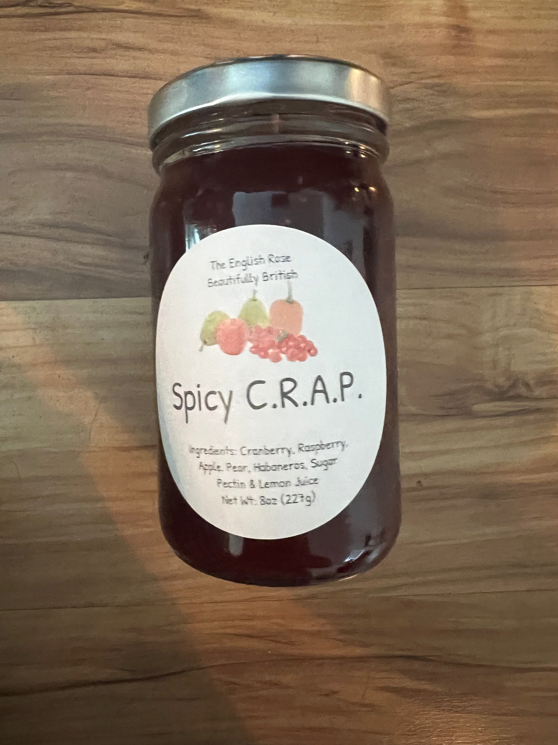 Spicy C.R.A.P jam by The English Rose "Beautifully British" Jams and Spice Blends is hand-crafted and comes in an 8 ounce jar. Standing for: Cranberry Raspberry Apple Pear.